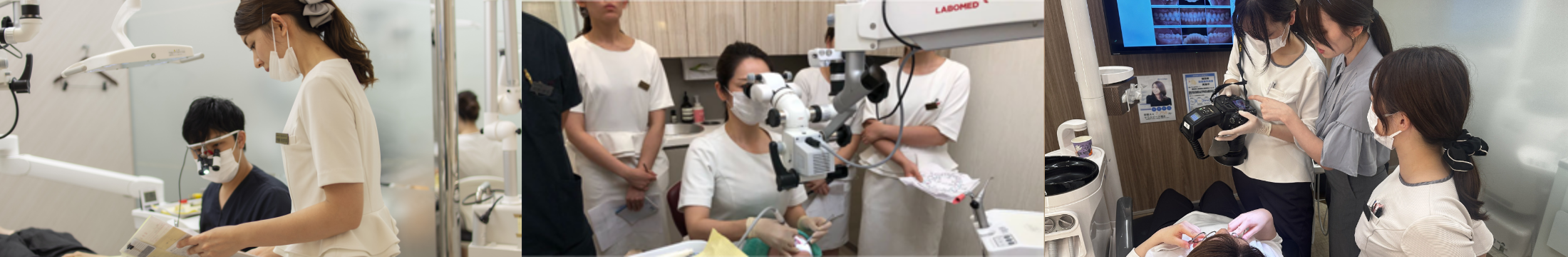 入社研修においては、まず就業規則の読み合わせと当院で勤めるにあたっての「あり方教育」から始めます。ここで、タイムカードの押し方から有給や休み希望の申請方法、病欠時の対応、スタッフ間のマナーやイオン独自のルールなどの認識をして頂きます。それからまずはクリニック内の材料等の場所やレントゲン撮影方法、そして患者様の治療の流れ、治療方法・手順、メインテナンスまでのシステムを説明し、当院の臨床フローチャートを理解して頂きます。まずは診療の流れを理解していただくためにもアシスト業務から経験してもらい、理解が進んだタイミングでご自身の担当列を持って頂きます。